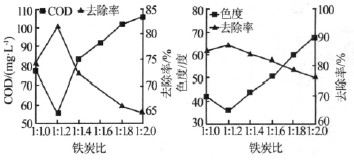 當Fe/C 微電解系統中鐵屑含量低時,增加鐵屑,可使體系中的原電池數量增多,從而提高對COD 和色度的去除效果;當炭屑過量時,反而會抑制原電池的反應,更多表現為炭的吸附性,因此應保持一個適當的鐵炭比。