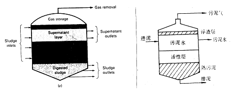 傳統消化池又稱為低速消化池,在池內沒有設置加熱和攪拌裝置,所以有分層現象,一般分為浮渣層、上清液層、活性層、熟污泥層等,其中只有在活性層中才有有效的厭氧反應過程在進行,因此在傳統消化池中只有部分容積有效;傳統消化池的最大特點就是消化反應速率很低,HRT很長,一般為30~90天。