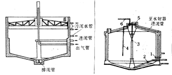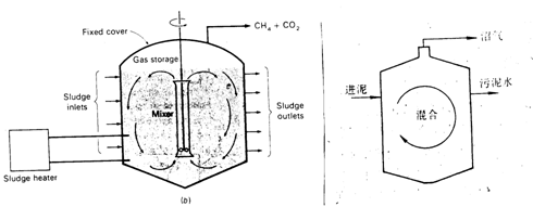 與傳統消化池不同的是,在高速消化池中設有加熱和/或攪拌裝置,因此縮短了有機物穩定所需的時間,也提高了沼氣產量,在中溫(30~35C)條件下,其HRT可以為15天左右,運行效果穩定;但攪拌使高速消化池內的污泥得不到濃縮,上清液與熟污泥不易分離。