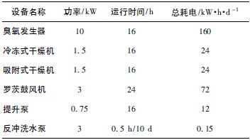 該套廢水深度處理系統(tǒng)運(yùn)行費(fèi)用主要為電費(fèi),耗電設(shè)備包括臭氧發(fā)生器(含冷凍式干燥機(jī)和吸附式干燥機(jī))、羅茨鼓風(fēng)機(jī)、水泵等(不計(jì)人工及折舊費(fèi))。各設(shè)備用電情況見(jiàn)表4。