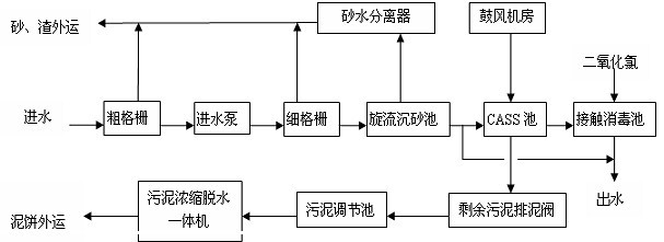 污水中含有大量較大顆粒的懸浮物和漂浮物,經過格柵截留,除去上述污物,對水泵機組及后續處理構筑物具有重要的保護作用。污水經集水池用潛污泵提升至廠內配水井中自流至細格柵,經過細格柵進一步去除細小顆粒的懸浮物和漂浮物,而后進入旋流沉砂池,在沉砂池中可除去比重較大的無機顆粒如砂等,通過旋流及攪拌作用,使無機顆粒分離至沉砂池底部。通過鼓風機股入壓縮空氣將砂氣提至砂水分離中,通過砂水分離進行砂和水分離。污水經沉砂池后由D=700mm的管道自流進入CASS池,經過CASS池曝氣、沉淀處理后,通過潷水器排除處理后的污水,通過二氧化氯接觸池進行消毒處理,污水達到GB18918-2002一級B類標準,完全達標后排放至小太平河。