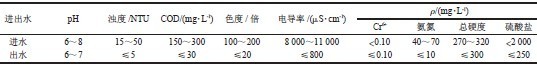 該公司現有皮革廢水回用工程設計處理能力為2 200 m3/d,采用雙膜法深度處理的組合工藝,其廢水經過處理后回用1 200 m3/d 至生產線。雙膜系統的進水為生化處理系統后的皮革廢水,具體水質及出水回用要求見表1。