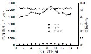 電導率可間接表征溶液中的鹽含量。脫鹽率的變化與給水水質組成、含鹽量、溫度及膜性能有關。由圖4 可知,進水電導率在8 000~11 000 μS/cm 之間,進水電導率受水質的影響變化較大,經反滲透系統處理后,產水電導率為312~488 μS/cm,反滲透系統對皮革廢水的脫鹽率達到95% 以上,這表明反滲透膜的脫鹽能力較強且出水水質穩定。
