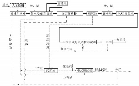 根據啤酒污水中的部分污染物質(主要是纖維素) 具有在堿性狀態下溶解,在酸性及近中性狀態下轉變為懸浮物的特性,我們擬在集水及pH 粗調池前進行酸堿的初步調節,以實現在預沉池中盡量多地沉淀懸浮物,盡量減少進入UASB 系統懸浮物的要求。