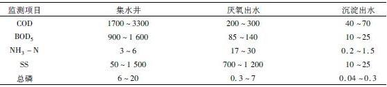 NH3-N 在厭氧出水后升高是由于厭氧反應的過程中,大量的有機氮轉變為氨氮造成的。從表4 可以看出,厭氧對COD 的去除率可以達到90%以上,BOD、氨氮、SS 和總磷等各項指標均可以達到90%以上的去除率,并實現穩定達標。