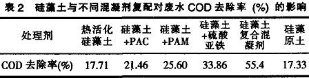 2.1硅藻土與不同混凝荊復(fù)配對(duì)COD去除率的影響通過(guò)探索試驗(yàn),在攪拌速度和時(shí)間、pH值、溫度等條件一定.確定投加總量為1.5e./L,將硅藻土與不同混凝劑進(jìn)行復(fù)配.測(cè)定上清液的COD值。