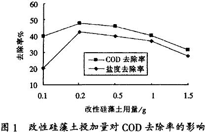 分別取150mL原水于6只燒杯中,調(diào)節(jié)一定pH后.投加一定量的改性硅藻土。然后置于六聯(lián)攪拌器上以250r/min快攪2min.再以70r/min慢攪10min。靜置一定時(shí)間后。取上清液進(jìn)行COD、鹽度測(cè)定。