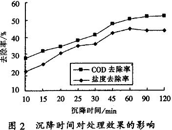 實(shí)驗(yàn)條件:150mL水樣,原水pH(8.68),投加0.2g改性硅藻土后在六聯(lián)攪拌器上攪拌一定時(shí)間后,靜置沉降不同時(shí)間,取上清液過(guò)濾測(cè)COD和鹽度,實(shí)驗(yàn)結(jié)果如圖2。