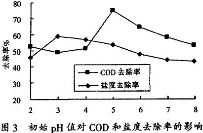 2.4初始DH值對(duì)COD去除率的影響實(shí)驗(yàn)條件:150mL水樣,通過(guò)改變?cè)畃H值,投加0.2g硅藻土復(fù)配混凝劑攪拌反應(yīng)一定時(shí)間后靜置沉降45分鐘.取上清液過(guò)濾測(cè)COD和鹽度,實(shí)驗(yàn)結(jié)果見(jiàn)圖3。