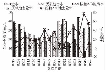 中試裝置進出水COD的變化如圖7所示。在整個運行期內(nèi),厭氧池和光伏A/O池對COD的平均去除率分別為64.2%和79.1%,厭氧池和光伏A/O池出水COD平均濃度分別為62.95mg/L和38.67mg/L。厭氧池去除率隨進水濃度變化波動較大,而光伏A/O池的去除率相對穩(wěn)定,說明光伏曝氣接觸A/O池抗COD沖擊負荷能力強。