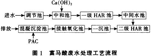 富馬酸廢水具有COD濃度高,pH值較低以及廢水可生化性能較好等特性。根據一般厭氧反應器的處理效率,若高COD含量的水經pH調節后,即使進入兩級厭氧反應器,也會造成反應器的負荷過高,且二級厭氧出水中COD的質量濃度仍將高達3000mg/L以上,遠遠超過一般接觸氧化池的負荷承受能力。因此工藝方案采用將原水稀釋1倍后作為后續處理的進水。經過兩級中溫復合式厭氧反應器(HAR)工藝去除大部分有機物,然后進好氧生物接觸氧化池處理,最后經加藥混凝沉淀后排放,以保證出水水質達到排放標準。廢水處理工藝流程如圖1所示。