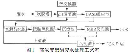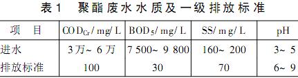 江蘇某化纖廠為聚酯生產廠, 生產過程中企業排放的聚酯廢水的CODCr高達3 萬~ 6 萬mg/ L; 酸性強, pH 為3~ 5; 無色透明且有刺激性氣味, 廢水排放總量為150 m3 / d。該廢水生化性較差, BOD/COD 為0. 27。針對此類廢水水質特點, 在實驗室研究基礎上, 采用UASB-水解酸化-接觸氧化-MBR 工藝, 經過實際運行, 處理后出水各項指標均達到了GB 8978 ) 1996 一級標準。