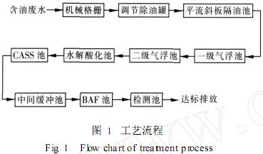 含油廢水首先經過機械格柵攔截大塊雜物,再經提升泵房提升至調節除油罐。除油罐對廢水中的污油和固體顆粒均有一定的去除作用。除油罐的出水自流進入平流斜板隔油池。經隔油處理后的廢水再自流進入氣浮除油階段,該階段分為兩級,一級采用渦凹氣浮,二級采用部分回流加壓溶氣氣浮。廢水通過以上物化處理后,基本完成除油任務,同時約有20%~30%的有機污染物也得到去除,隨后進入生化處理階段。