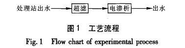 試驗地點為大慶采油二廠聚南八污水站(采用自然沉降、混凝、兩次壓力過濾工藝),其出水先進入超濾膜進行預處理,然后進入電滲析裝置。調節電滲析的電壓分別為5、10、15、20、25、30V,固定濃水和極水流量均為50L/h,調節淡水流量為100、150、200、250、300I/h進行脫鹽試驗。具體工藝流程見圖1。