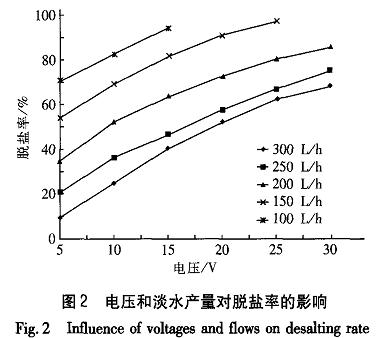 由圖2可知,當淡水產量固定時,脫鹽率隨電壓的提高而逐漸增加,最高脫鹽率可達95%以上;在相同的電壓下,產量越大則脫鹽率越低;如要達到相同的脫鹽率,則產量大時所需電壓高。
