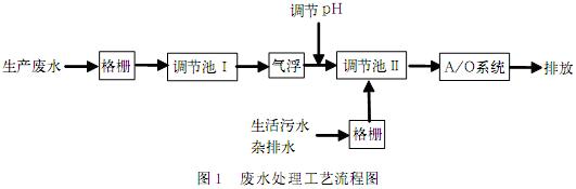 生產廢水經格柵去除大的雜物后進入調節池Ⅰ均質均量,用泵提升進入氣浮系統,出水經過調節pH值后進入調節池Ⅱ;生活污水和雜排水經收集后進入調節池Ⅱ,由泵提升進入生物接觸氧化和消毒系統(AO成套設備),系統出水達標排放。廢水處理工藝流程見圖1。