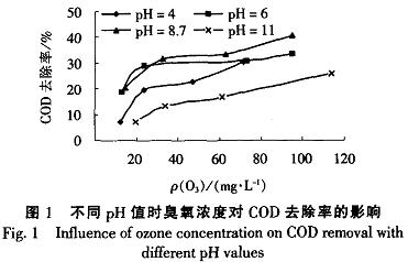 2.1反應(yīng)條件對COD去除率的影響在不同的pH值條件下.改變通人廢水中的臭氧量,廢水COD去除率的變化規(guī)律見圖1。