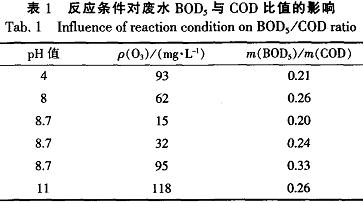 2.2反應(yīng)條件對廢水BOD與COD比值的影響表1是在不同的pH值,及不同的臭氧濃度下廢水BOD與COD比值的變化情況。
