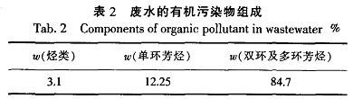 2.3臭氧氧化法處理前后廢水的UV254比較表2是廢水中的有機(jī)物組成。從表2可以看出,廢水中的有機(jī)污染物主要是難降解的芳烴,尤其是大分子的雙環(huán)和多環(huán)芳烴的所占的比例較大.這正是該類廢水的可生化性較差的原因。