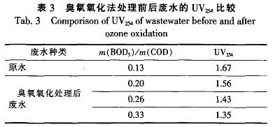 芳烴類物質(zhì)的紫外光譜在波長254nm處有很強(qiáng)的吸收峰,因此,UV的大小也可以反應(yīng)出廢水中難生化降解的芳烴類物質(zhì)的多少。表3比較了廢水和幾種臭氧氧化法處理前后水的UV大小。從表3可以看出,經(jīng)過氧化處理后廢水的UV瑚都有所降低說明廢水經(jīng)過臭氧氧化處理后。其中難生化降解的芳烴類物質(zhì)減少了.可生化性得到改善;從表3還可以看出,經(jīng)臭氧處理后的廢水UV254的數(shù)值越小,廢水的BOD與COD的質(zhì)量比越大。說明經(jīng)過臭氧氧化后廢水中的大分子難降解的芳烴類物質(zhì)越少,廢水的可生化性越好。