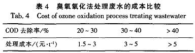 從表4可以看出,采用臭氧氧化法處理廢水隨著廢水COD去除率的增加,處理成本也逐漸增大,在廢水的COD去除率為20%~3O%時。每噸廢水處理成本為1.5—3元,而當(dāng)廢水的COD去除率大于40%,其處理成本超過5元/t。因而單純從降低廢水COD的角度看,采用臭氧氧化處理經(jīng)濟(jì)上并不合算。而采用臭氧氧化對廢水適度處理。提高廢水的m(BOD)/m(COD),再通過進(jìn)一步生化處理來降低廢水的COD從經(jīng)濟(jì)上更加合理。