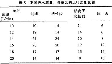 由表5、圖2可以看出.每個流量下的各單元運行周期長短并不一致.其中多介質(zhì)過濾階段運行周期最長的是14L/rain.活性炭吸附階段運行周期最長的也是14L/min鈉離子交換器運行周期最長的是10Umin和12Umin納濾運行周期最長的是20Umin.綜合比較當(dāng)進(jìn)水流量為16IJmin時雖然不能使所有單元都達(dá)到最大周期但是可以使各單元比較均衡的貼近裝置運行的最大周期,而且在O=16Umin時.納濾膜產(chǎn)水率最大,故最佳進(jìn)水流量選16IJmin。