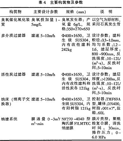 (2)最佳進(jìn)水流量Q=16Umin,此時,對應(yīng)多介質(zhì)過濾器、活性炭過濾器、納離子過濾器濾速為8m/h,停留時間13min,納濾膜膜通量16Umin.操作壓力0.45MPa;臭氧最佳投加量2mg/L,接觸時間13rain。