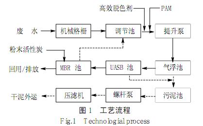 工藝流程如圖1所示。廢水經機械格柵去除大塊雜物和懸浮物,然后進入調節池,調節水質和水量。廢水調節后用離心泵提升進入氣浮系統,同時向離心泵進水管加入高效脫色混凝劑和助凝劑PAM,通過水泵葉輪實現高效混合。在氣浮系統內,在微氣泡粘附下,廢水中大部分細小懸浮物、發色有機物、洗滌劑被去除。經氣浮處理后廢水自流進入UASB池上方的配水槽,廢水經配水管進入UASB池底均勻布水,在該池內廢水中大部分有機物被馴化好的厭氧顆粒污泥分解,轉化為沼氣和水。經UASB厭氧處理后的出水通過三角堰均勻進入出水槽,自流進入MBR池,在MBR池內通過高濃度的好氧菌的降解和定量加入的粉末活性炭的協同吸附作用廢水中的有機物被去除,再經微濾膜分離后廢水得以凈化,最后出水直接由自吸泵打入工廠低水質用水場合和工廠排污口。MBR產生的少量污泥回流進入調節池,回流的活性污泥可以吸附并降解水中的污染物,有利于后續的氣浮分離,也降低了氣浮系統的加藥量,氣浮浮渣和UASB剩余污泥自流進入污泥池,經螺桿泵打入板框壓慮機脫水后外運。
