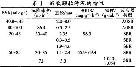 在好氧條件下,培養(yǎng)顆粒污泥的條件較為苛刻,并且在不同操作條件和培養(yǎng)目的下培育出的好氧顆粒污泥在顆粒大小、粒徑分布、顏色、功能上也都存在著差異。好氧顆粒污泥的特性:表面光滑、較高密度和高強度、高生物量、耐沖擊負(fù)荷、抗有毒物質(zhì)。好氧顆粒污泥外觀一般為橙黃色或淺黃色,周洵平等總結(jié)了不同反應(yīng)器在各自條件下培養(yǎng)的好氧顆粒污泥的特性,見表1。