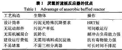 ABR因其特殊的結(jié)構(gòu),與其它厭氧生物處理工藝相比,具有許多優(yōu)點(diǎn),見(jiàn)表1。