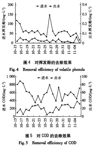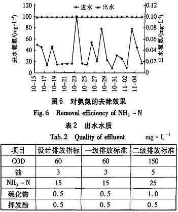 該污水處理廠自2003年6月運行以來,經過前期的調試和運行經驗的積累,現在的運行情況良好,對各類污染物的處理效果見圖2—6。由圖可以看出,進水水質變化非常劇烈,水質也較差。對于出水水質,大連石化分公司在實際運行中執行《污水綜合排放標準》(GB8978--1996)與遼寧省地方標準《遼寧省沿海地區污水直接排人海域標準》(DB21-59-89),要求必須達到其中的二級標準,力爭達到一級標準,具體指標如表2所示。從實際運行結果來看,出水完全能夠達到一級排放標準,同時也達到了設計指標,但是從出水監測的數值來看,出水中的油含量有兩次未達到一級排放標準,而達到3.5mg/L,分析原因為DCI除油裝置和DFA氣浮裝置在此期間運行不太正常所致。