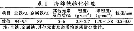 海綿鐵外觀灰黑色有亮點,呈疏松海綿狀,是由鐵、炭及其他雜質(Mn,Cr,Ni,CaO,MgO等)組成的合金,其物化性能如表1所示。