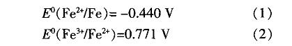 海綿鐵作為水處理材料使用時,其中的金屬鐵是主要化學成分。鐵是活潑金屬,其在水溶液中的電極電位較低,具有還原能力,可將金屬活動順序表中排于其后的金屬置換出來而沉積在鐵的表面,還可將氧化性較強的離子、化合物及某些有機物還原。在水溶液中,Fe2+也具有一定的還原性,存在強氧化劑時。Fe2+可進一步被氧化成Fe3+,Fe2+及Fe的電極電位如式(1)和式(2)所示。
