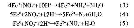 馮艷萍等利用自制的球形海綿鐵對水體中硝酸鹽的去除進行了實驗研究.結果表明:溶液初始pH對硝酸鹽的去除率影響顯著,pH<2時,硝酸鹽的去除率在63.29%以上,而pH>2后,硝酸鹽的去除率急劇降低,只有20%左右。這與溶液發生的電化學反應有關。S.Choe等[35認為零價鐵金屬在去除硝酸鹽的過程中,可能發生如下的化學反應: