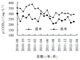 水解酸化池穩定運行期間進、出水CODCr濃度見圖4。