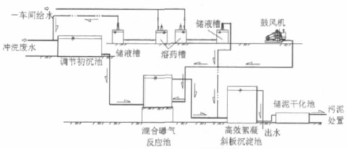 由于攀鋼鈦白粉廠一車間為兩層建筑,進水口在二層,出水口在一層,可以利用車間現狀,使廢水及污泥在各處理構筑物之間靠重力自流,利用自然高差進行流水線處理。因此本工程將兩個溶藥槽、兩個儲液槽以及計量泵、鼓風機和調節初沉池設置在車間二層;車間一層則設置混合曝氣反應池、高效絮凝斜板沉淀池和污泥干化池。