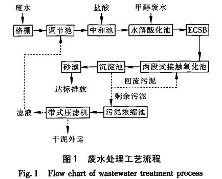 廢水經(jīng)格柵去除絕大部分懸浮顆粒物后進(jìn)入調(diào)節(jié)池,再進(jìn)入中和池,通過(guò)投加HC1調(diào)節(jié)pH值。中和池出水自流進(jìn)入廊道式水解酸化池,以改善廢水的可生化性。經(jīng)水解酸化后的廢水被泵提升至EGSB反應(yīng)器,充分降解溶解性有機(jī)物。EGSB反應(yīng)器出水進(jìn)入兩段生物接觸池進(jìn)行好氧生物處理,在二沉池內(nèi)進(jìn)行泥水分離,最后進(jìn)行砂濾處理,實(shí)現(xiàn)達(dá)標(biāo)排放。沉淀池污泥部分回流至水解酸化池或兩段生物接觸氧化池,剩余污泥進(jìn)入污泥濃縮池,濃縮污泥經(jīng)帶式壓濾機(jī)壓濾后外運(yùn)填埋。