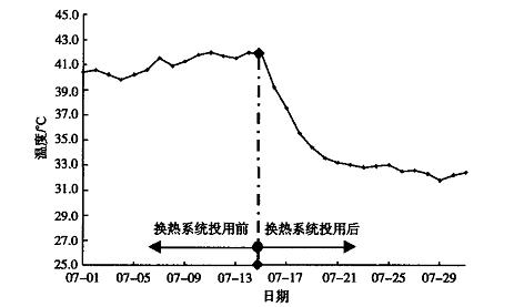 由圖2可以看出.在換熱系統(tǒng)投用前,反應(yīng)器溫度大多在40~42℃,居高不下;在換熱系統(tǒng)投用后,反應(yīng)器溫度下降迅速.在3~4d時(shí)間內(nèi)溫度迅速下降到35℃以下,并逐步穩(wěn)定在32~33℃的較適宜溫度范圍內(nèi),降溫效果顯著。