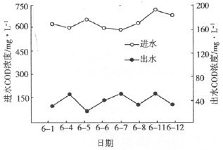 由圖3可以看出,系統(tǒng)在6月1~12日期間,進(jìn)水CODCr平均濃度為643.75mg/L,出水平均濃度可降至46.50mg/L,平均去除率92.78%。