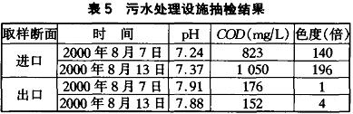 光華集團造紙廢水與印染廢水綜合治理工程于2000年5月完工。經過三個月調試后,進人穩定運行狀態。2000年8月7日和8月13日兩次對所排廢水的監測抽查結果見表5。