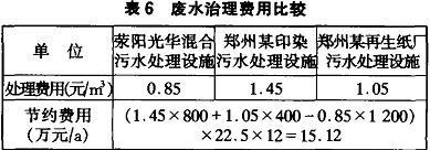綜合治理工程總投資僅為120萬元,比建兩套處理設施可節約投資30%。處理費用為0.85元/,與同規模印染、造紙廢水廠運行費用比較見表6。