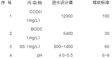 該淀粉廠廢水主要來源于生產過程中的工藝廢水(主要包括蛋白液、中間產品的洗滌水、各種設備的沖洗水等),廢水中有機物含量較高,CODcr含量為12000mg/L,BOD5/CODcr=0.53,可生化性較好。廢水處理工程的設計規模1000m3/d,處理后水質要求達到《污水綜合排放標準》(GB8978—1996)一級排放標準,進水水質和排放標準見表1。