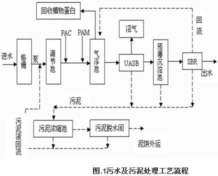 馬鈴薯淀粉生產廢水本身含有機質多、濃度高且懸浮物含量大,廢水BOD5/CODcr=0.53,可生化性較好,同時在本工程中出水水質要求較高。考慮到以上因素,工藝選用物理與生化處理相結合的方式。物理法通過藥劑投加、絮凝氣浮工藝主要去除懸浮物、膠體物質及部分有機物,同時回收植物蛋白飼料。針對廢水本身有機物濃度高的特點,生化處理采用厭氧-好氧相結合的處理工藝。