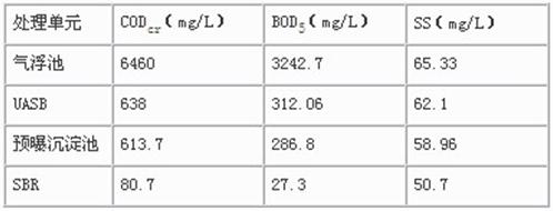 氣浮池出水流入UASB厭氧反應器,由于淀粉廢水呈酸性,會使后續厭氧處理過程受到抑制,產甲烷菌不能承受低pH值的環境,UASB反應器運行的最佳pH值為6.8~7.2。因此,本工程采用出水回流的方法用出水堿度調節pH值,雖然進水pH值有波動,但并不影響反應器的正常運行。在產酸菌和產甲烷菌的作用下,將大部分的有機物分解為無機小分子物質和甲烷,剩余污泥進入污泥濃縮池,甲烷通過三向分離器收集凈化處理后可以作為能源供生產、生活使用,出水則流入預曝氣沉淀池。預曝沉淀池是厭氧處理單元和好氧處理單元之間的重要構筑物,其功能主要是去除厭氧出水的懸浮物和H2S等有害氣體,增加水中的溶解氧,為好氧處理創造有利的條件。預曝沉淀池的出水自流進入SBR進行好氧生物處理,以進一步降解水中的有機物。