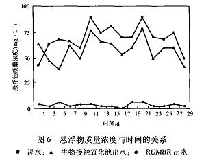 d)廢水在生物接觸氧化池中的水力停留時間為10h,生物接觸氧化池中細菌濃度為1×10。個/mL,RUMBR出水中油質量濃度在1mg/L以下,懸浮物質量濃度在3mg/L以下。