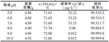 從表1 可見,隨著pH 的增加,鉻的回收率逐漸增大,鉻黃質量和PbCrO4質量分數也逐漸提高,但堿性過大時有所下降。因此將母液pH 調整至9.0。