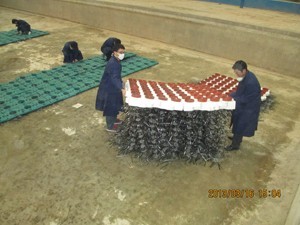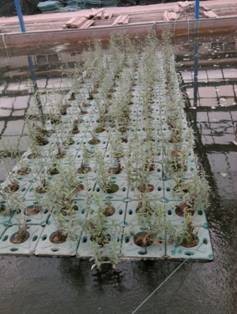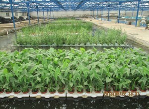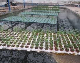 本工程示范中,共制作大型浮島11座,共158 m2,占整個水面面積的27.8%。分為泡沫浮島和聚丙烯浮島,其中泡沫浮島共80平米,每平米16個花盆, 16束生物碳纖維材料;聚丙烯浮島78平米,每平米9個花盆,12束生物碳纖維材料。浮島種植植物品種包括小香蒲、紫花梭魚草、美人蕉、慈姑、狐尾藻、菖蒲、千屈菜、黃花鳶尾等,浮島按照植物種類進行種植。浮島完成后總體呈長方形,橫放于池子當中,兩邊用尼龍繩固定在岸邊,防止浮島隨著水流移動。種植完畢后將浮島進行固定,開始放水。
