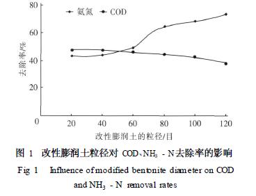 膨潤土投量為40 g/L、振蕩速度為200 r /min時,于常溫下反應60 min,考察改性膨潤土粒徑對COD、NH3 - N去除率的影響,結果見圖1。