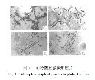 在4 ℃條件下培養(yǎng)得到的4 種耐冷菌菌落:C1 菌落大而扁平,邊緣整齊,乳白色;C2 菌落中等大小,扁平,邊緣整齊,乳白色;C3 菌落中等大小,稍隆起,邊緣整齊,乳白色;C4 菌落小,隆起,邊緣整齊,黃色. C1 為革蘭氏陽性球菌,C2 、C3 、C4 均為革蘭氏陰性桿菌. 各菌株顯微攝影照片見圖1.