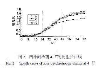 實(shí)驗(yàn)結(jié)果見圖2. 隨著溫度的降低,耐冷菌的生長速率降低較慢[9 ] . 多數(shù)耐冷菌在接近最適生長溫度(15 ℃) 在土壤浸汁蛋白胨培養(yǎng)基上的比生長速率為(0. 050~0. 205)Ph ,而在0 ℃下的比生長速率為(0. 022 ~ 0. 047)Ph , 比生長速率降低1P6~1P2[10 ] . 本文分離到的四株耐冷菌在4 ℃條件下72 h 內(nèi)的比生長曲線如圖2 所示,根據(jù)生長曲線測得各菌比生長速率分別為0. 060Ph ,0. 065Ph ,0. 080Ph ,0. 075Ph ,由此看來這四種耐冷菌在低溫下的活性相對(duì)較高.